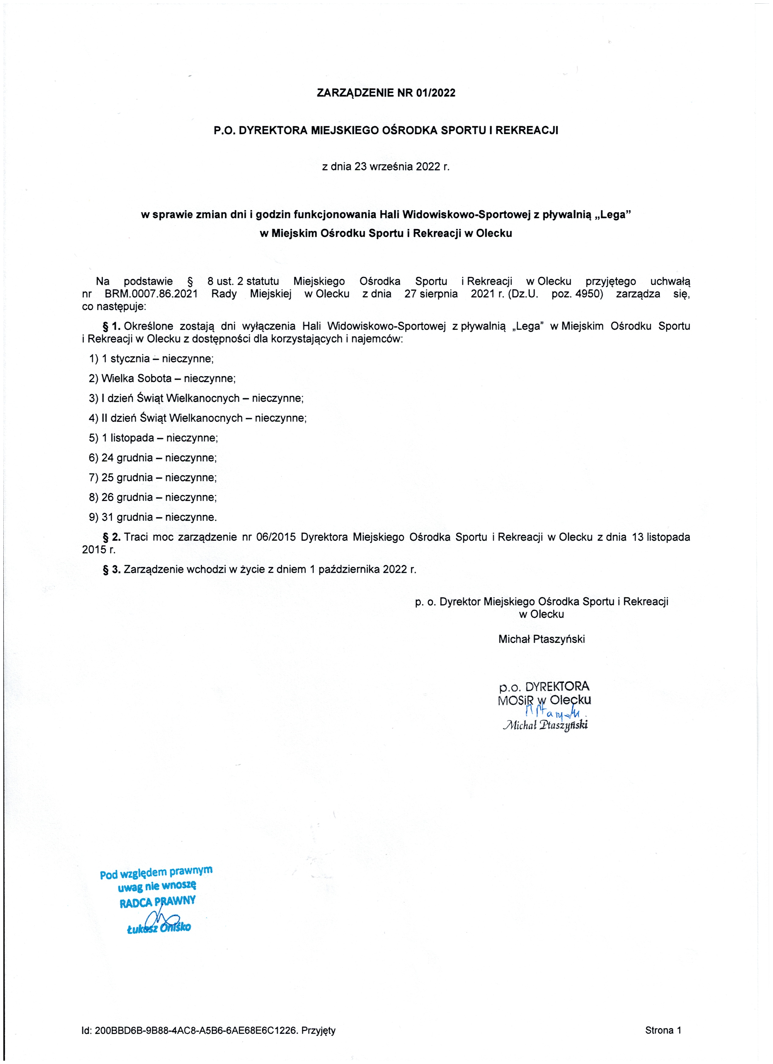 Zarządzenie nr 01/2022 dyrektora Miejskiego Ośrodka Sportu i Rekreacji z dnia 23 września 2022 r. w sprawie zmian dni i godzin funkcjonowania Hali Widowiskowo-Sportowej z pływalnią 'Lega' w Miejskim Ośrodku Sportu i Rekreacji w Olecku.