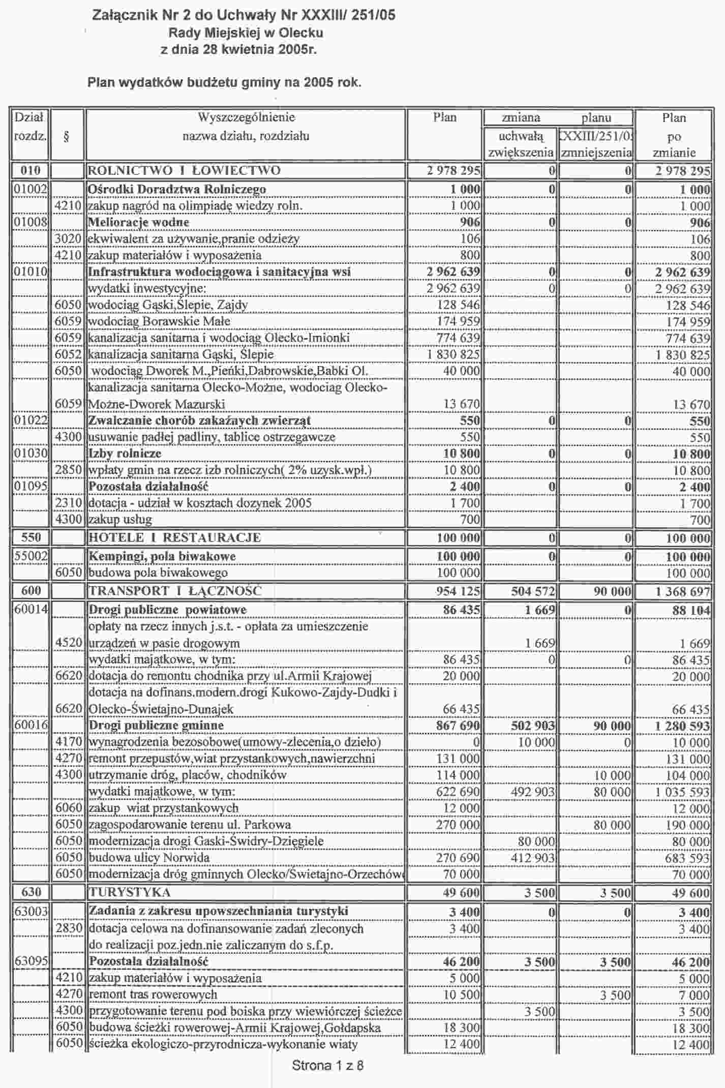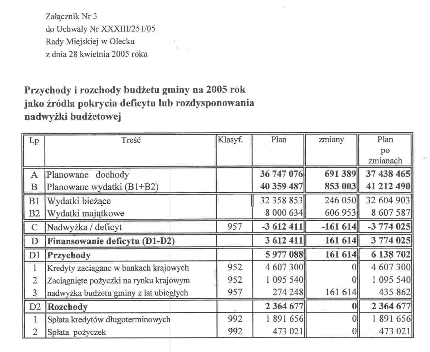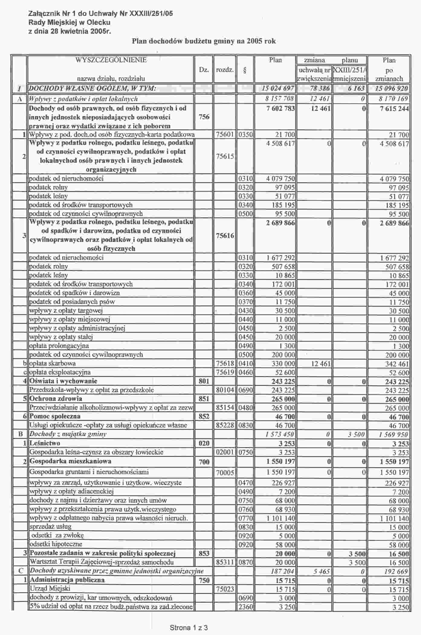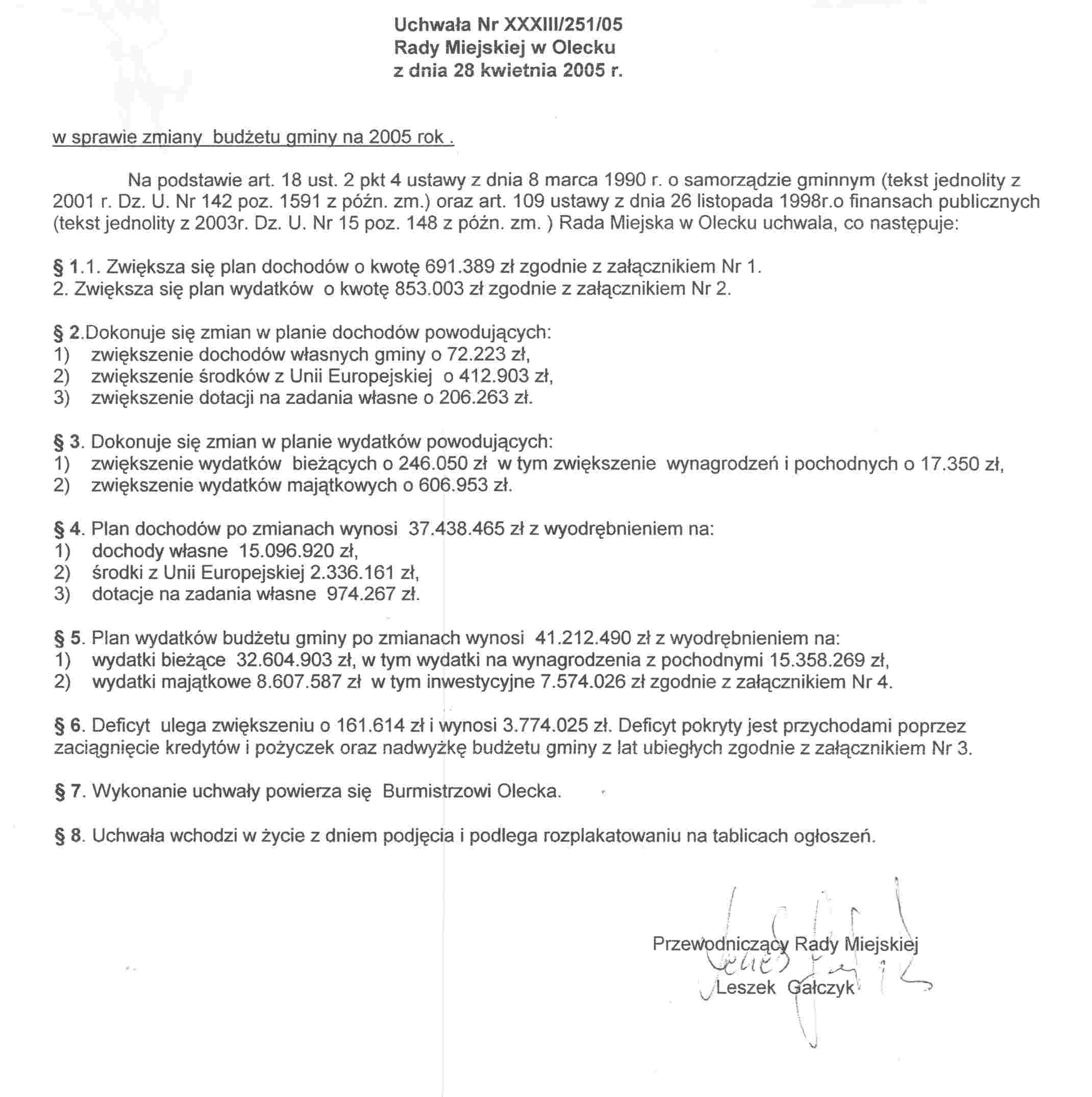 Uchwała Nr XXXIII/251/05 z 28 kwietnia 2005r. w sprawie zmiany budżetu gminy na 2005 rok